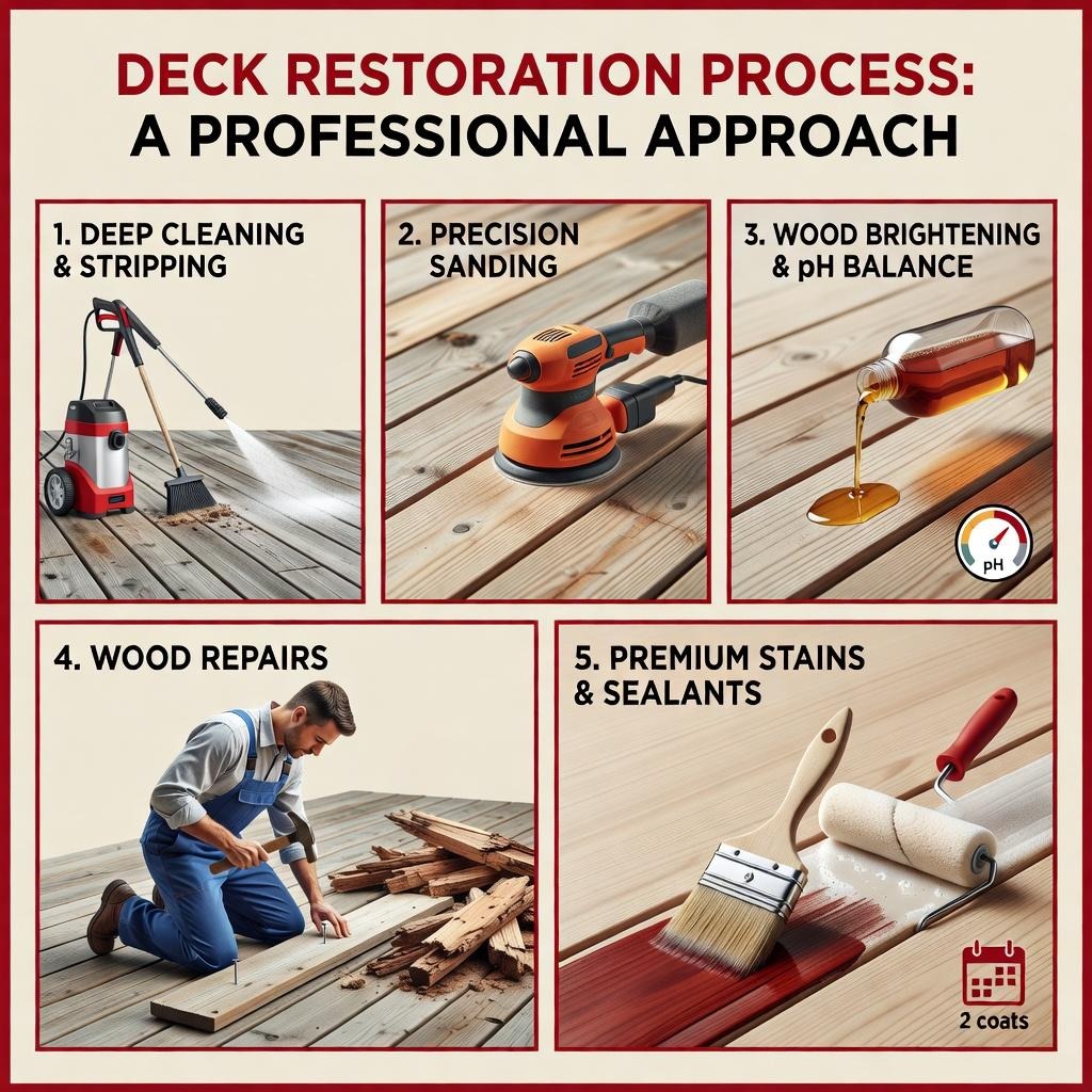The typical deck refinishing process is comprehensive, moving from initial cleaning to final sealing with meticulous attention to detail. It usually involves several critical steps: